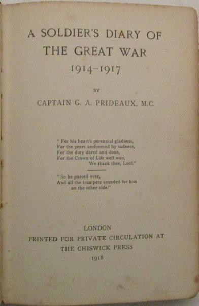 Geoffrey Arthur Prideaux was born in 1891, educated at Eton and Sandhurst and commissioned in the Somerset Light Infantry in March 1911. Served continuously with the 1st Battalion (11th Brigade, 4th Division) in France and Flanders from August 1914-August 1915 (apart from a spell in hospital, December 1914-March 1915), as Battalion Transport Officer, Company Commander and thereafter as Staff Captain then Brigade Major of the 11th Infantry Brigade, until killed in action by shellfire on 19th January 1917 whilst making a reconnaissance from the forward trenches. He was twenty-five and is buried in Hem Farm Military Cemetery. The volume includes his detailed and interesting daily diary from August 1914-14th January 1917 containing much interesting and in-depth detail on the services of the 1st S.L.I. and other units of the 11th Brigade – including on the first day of the Battle of the Somme – followed by several letters of condolence. Orig. brown paper covered boards with cloth backstrip, little rubbed & worn, generally VG & rare.