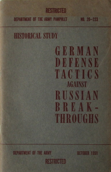 Official Department of the Army Pamphlet (or DA Pam) 20-233. One of a series of monographs on aspects of WW2 campaigns. This one discusses improvisation in the German Army on the Russian front. Orig. printed wraps., VG. See illustration on our website.