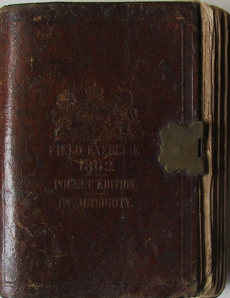 All permutations from Recruit & Squad Drill to Company movements, Rifle Exercises, Evolutions of a Battalion &c. &c. Orig. red leather binding, much serviceworn, brass clip defective. See illustration on our website.