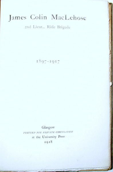 James Colin MacLehose was elder son of J.C. MacLehose, publisher to Glasgow University, and his wife Mary. He was educated at Rugby, 1911-16; from school he went to the 4th Officers' Cadet Battalion at Oxford, was commissioned in the Rifle Brigade in November and joined the 16th (Service) Battalion in France in January 1917. He was killed in action on 14th February – rather less than six weeks after arriving – his last words as he was wounded being "Carry on, men, carry on." He was leading a raiding party in a night raid east of Ypres and had not even reached the German wire when mortally wounded; the raid failed, the wire being uncut by the artillery preparation. He lies in Brandhoek Military Cemetery and was nineteen years of age. Contains a memoir of his life with recollections by contemporaries.Orig. brown paper covd. boards with leather lettering label to spine. VG. See illustration on our website.
