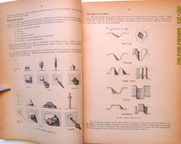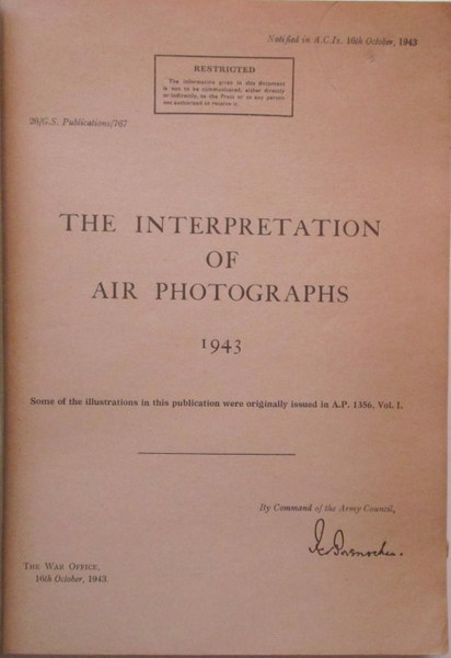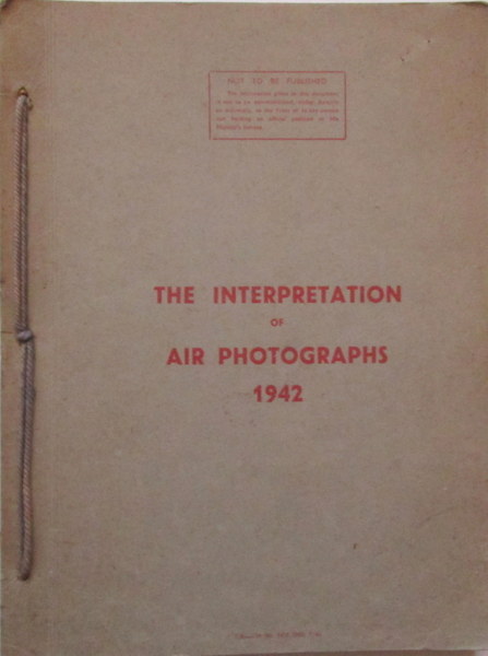 Official RESTRICTED publication containing detailed notes on use of air photographs & their characteristics, types of such photographs, photographic tone, use in conjunction with maps, stereoscopic examination, interpretation of artillery & various other subjects, fortifications, entrenchments, machine gun posts, &c. &c. Contents retained by cord tie with stiff card wraps., the front with Not To Be Published statement & title printed in red & dated 1942, although the contents here offered are the 1943 edition. 15,000 copies were printed & issued to infantry, engineer & artillery regiments, various military schools & training units, which demonstrates the importance of the matter with which it is concerned, but considering that it is a scarce survival. VG throughout.