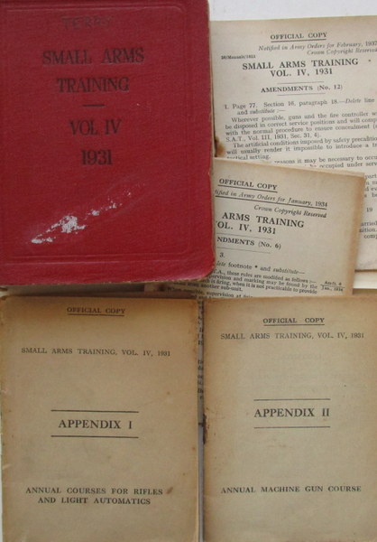 Official pocket manual. VG with a large number of Amendments pasted in or loosely inserted, together with two supplements: Appendix I: Annual courses for Rifles & Light Automatics (orig. printed wraps., 74pp.) & Appendix II: Annual Machine Gun Course (orig. printed wraps., 29pp.). One would be challenged to find a more complete example.