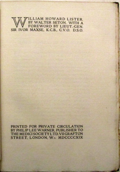 Memoir of Captain William Howard Lister, D.S.O., M.C. (and two Bars), Royal Army Medical Corps, who was Ed. at the Friends' School at Ackworth, Buxton College & University College, London. He served with the Red Cross in the Balkan War 1912-14 then became a House Physician at University College Hospital in July 1914, but before taking up residence the war broke out and he immediately obtained a commission in the R.A.M.C., was posted to the 16th Field Ambulance in France, & was in action at the Marne & Aisne until wounded on 23rd October 1914. Recovering from serious wounds, he joined the 18th Division on the Somme in 1916 & was killed in action in Italy in August 1918 whilst serving with the 21st Field Ambulance. He was 31 & is buried in Magnaboschi British Cemetery on the Asiago Plateau. Orig. blue cloth with white buckram backstrip, gilt, number 85 of 500 copies. See illustration on our website.