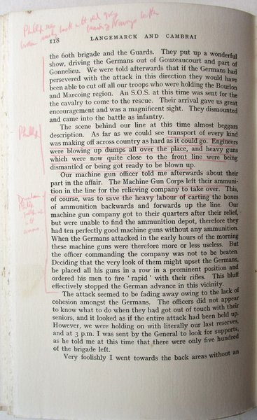 Excellent, scarce locally printed memoir of service with Shropshire Yeomanry in UK then posted to 6th King's Shropshire Light Infantry in France, Sept. 1916. Fine personal account of the battles named in the title & other events on active service 1916-18. Orig. black cloth, white ink titling to front & sp., VG in sl. chipped but very rare & striking pictorial dw featuring illustration 'The Tank Battle' by John Dugdale. The author Henry Williamson's copy, inscribed thus in red pencil alongside "Shallowford, 1932." Additionally, a number of passages are marked & annotated in the same red pencil (plus one or two later annotations in biro), some being caustic comments or suggestions re the writer's prose, others referencing "P" or "Phil" indicating use of them for ideas & inspiration for the 1917 volume of "Chronicle of Ancient Sunlight" (i.e., "Love & The Loveless"), particularly during the Battle of Cambrai, such as, when Dugdale writes: "As far as we could see on the right they marched, three brigades in line, each battalion in fours. I cannot describe in words what a wonderful sight it was" HW adds in the margin "Ph. sees this." This is just one of a number of occasions when Dugdale's experiences were adopted for Phillip Maddison. In other places, HW is critical, such as when Dugdale writes: "My battalion snipers had the time of their lives: never before had they been given such targets. We literally kept a game book of hits for the first three days" HW adds a marginal note: "Caddish betrayal also FOOL to awaken hostility." See illustrations on our website.