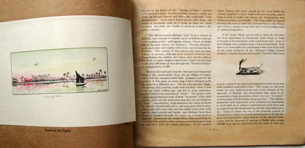 Letterpress descriptions & appealing sketches (many tinted, all captioned) of various locations in Mespot. mainly along the Tigris from Basra onwards to Amarah, Kut-el-Amarah, Baghdad, &c. Author served with 7th Bn. Gloucestershire Regiment during the campaign & writes in his Foreword: "...it is only in consequence of our army's victories that we are now able to scrutinise more closely the little towns & villages which nestle on the banks of the Tigris & of the Shatt-el-Arab. I have chose one or two of the more well-known scenes to sketch & to describe & have also mentioned, where possible, notable characteristics of the people & of the country as I have discovered them..." Wirestitched (stapled) contents pasted into dec. wraps., an economical form of binding now somewhat loose, edges little chipped, somewhat worn overall, generally VG & rare (just on copy on JISC/Library Hub, at BL). See illustrations on our website.