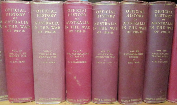 Official History of Australia in the War: Complete Set of 12 Vols., The Story of Anzac, 2 Vols., From the Outbreak of War to the end of the First Phase of the Gallipoli Campaign, May 4, 1915; From 4 May, 1915, to the Evacuation of the Gallipoli Peninsula; The A.I.F. in France, 4 Vols., 1916; 1917; December 1917-May 1918 & During the Allied Offensive 1918; Sinai & Palestine; The Australian Air Force; The Royal Australian Navy; The Australians at Rabaul; Australia During the War; Photographic Record of the War: Reproductions of Pictures Taken by the Australian Official Photographers.