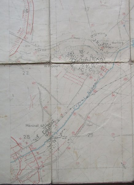 Small portions of the Hindenburg Line south of Wancourt & Geumappe & north of Cherisy, Heninel &c. (the line in front of Monchy-le-Preux &c.) Trenches corrected to 9/2/1917 (before the Battle of Arras). Small piece cut from margin o/w VG. See illustration on our website.