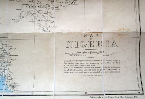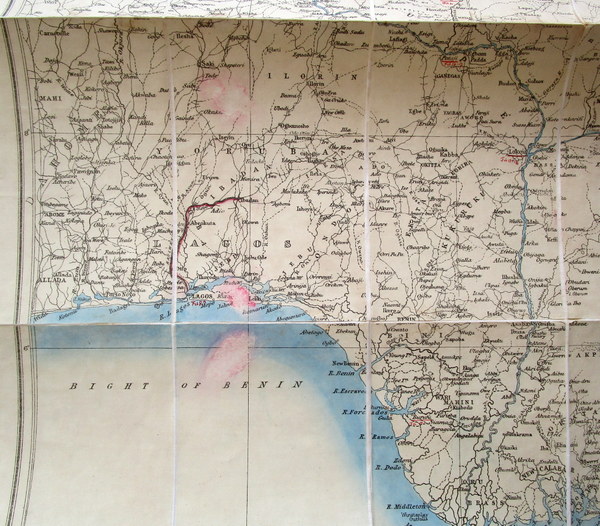 Official map "Compiled in the Intelligence Division, War Office, from boundary surveys & from sketches, route surveys etc., executed at various times by officers of the Royal Niger Company & others. Much of the information embodied was obtained during hurried journeys through difficult country, & with some exceptions, the positions of villages, rivers & roads are to be regarded as only approximate." VG but for small stain (near Lagos), neat underlining & dates along a route evidently travelled by the original owner, housed in contemp. cloth case with Edward Stanford's paper label "Sole Agents in London for the sale of Ordnance Maps."