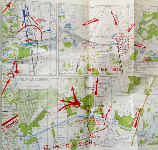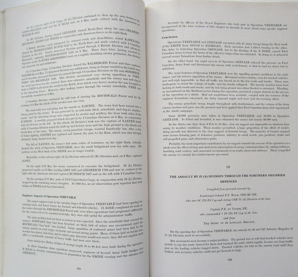 1st Ed., 2 Vols., foolscap, xviii+217pp., 49 photos., 37 maps on 14 fldg. leaves [and:] x+83pp., 31 maps. Chief Engineer, British Army of the Rhine. Feb.