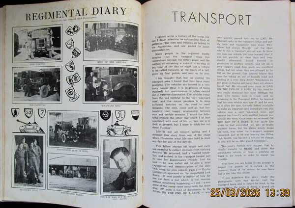 A very good run from the first post-WW2 edition onwards, commencing with a historical account of the regiment in the war (North Africa, Italy & NW Europe), with Rolls of Honour. Various articles follow including account of an Italian Battlefield Tour (Gothic Line), several pieces re ops. in NW Europe (inc. Villers Bocage), an officer's account of PoW life & escapes, much on regimental personalities, Squadron Notes, news & changes, training programmes &c., generally reflecting conditions of service in occupied Germany post-WW2. Many amusing period cartoons, some interesting photos. (inc. unfinished Panther tanks in a Hannover factory), a photo-story "Day in the Life of a Trooper" & more. Vols. 2-4 bound in two vols. in dec. paper covd. boards, rest in orig. dec. wraps., Attractive & scarce journal, VG throughout.